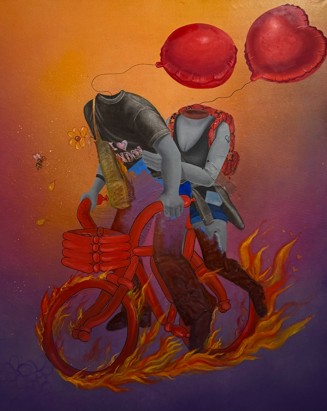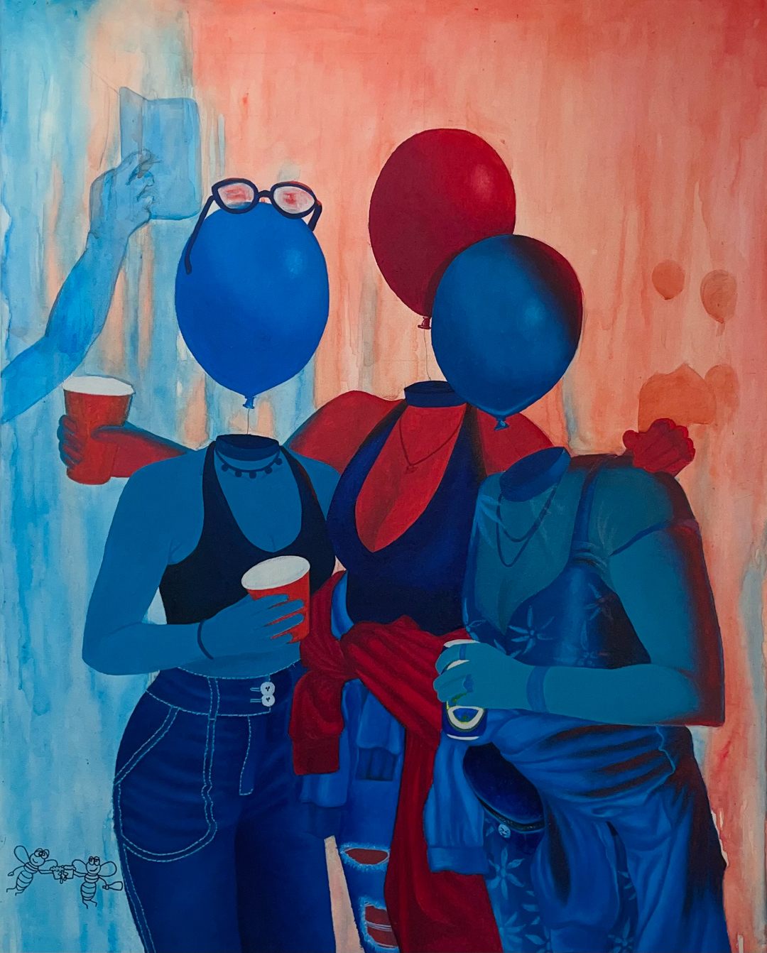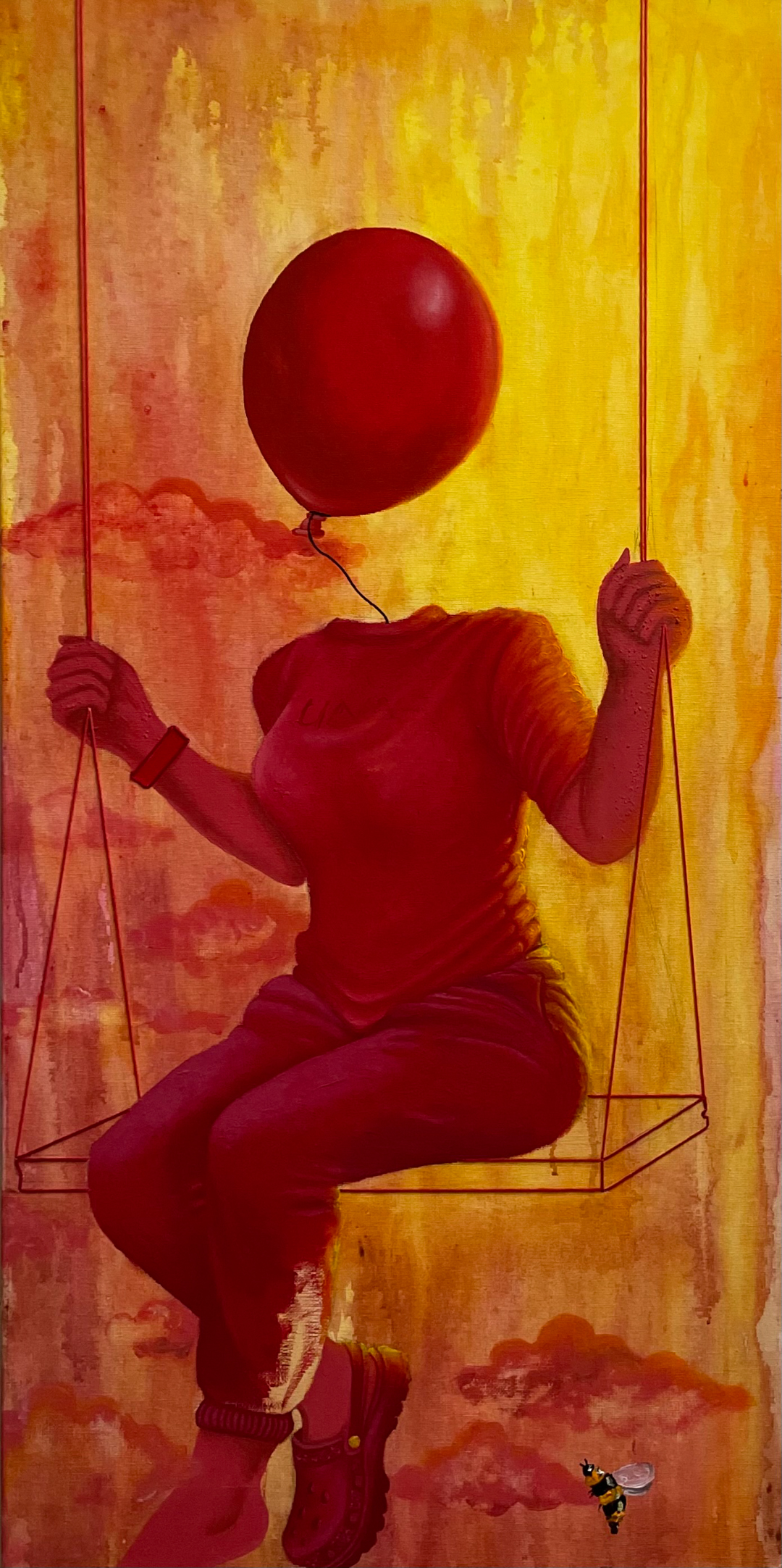 Amidst those continuing this parallel tradition of art history is Maureen Uzoh, a London-based Nigerian artist whose balloon-head figures reflect on familiar feelings of wanting to pursue one’s hopes and dreams but also being literally tied down by society’s expectations of them. Inspired by personal circumstances, her paintings are grounded with self-referential elements that allude to her Nigerian heritage and life experiences.