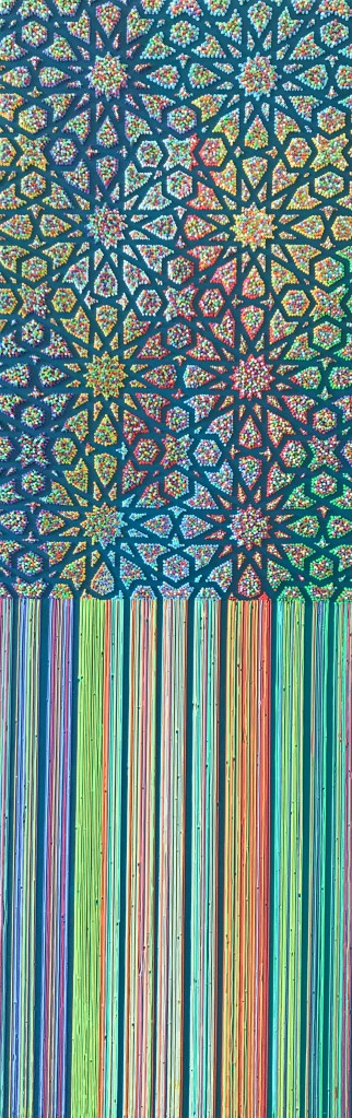 Another case in point is Silent Presence (2023). The composition – created used a syringe – consists of an ancient Persian wine-server, historically called the Saqi (or Saghi), on a gold background with colourful dots and framed inside a pointed arch. In Sufi mysticism, the saqi is a spiritual guide, serving wine that represents divine love. The act of drinking symbolises the dissolution of the ego, enabling a union with the divine. Above the arch on a dark blue sky are several constellations including Leo, whose brightest star is the kingly Regulus, one of the four Royal Stars of Persia. In fact, stars in Islamic geometry represent the divine attributes of God, including perfection, unity, and light.
