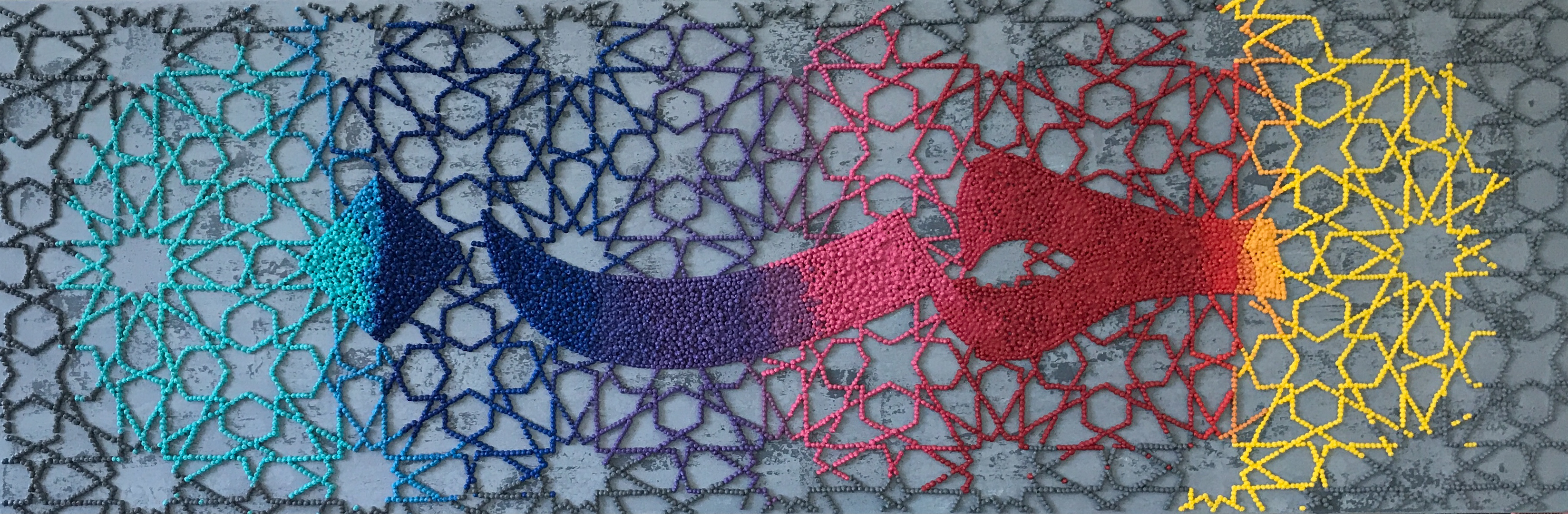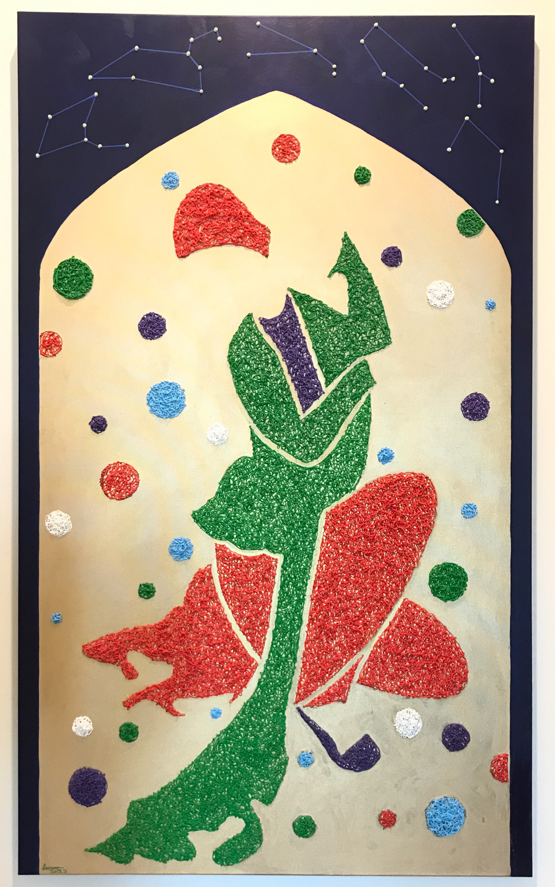Another case in point is Silent Presence (2023). The composition – created used a syringe – consists of an ancient Persian wine-server, historically called the Saqi (or Saghi), on a gold background with colourful dots and framed inside a pointed arch. In Sufi mysticism, the saqi is a spiritual guide, serving wine that represents divine love. The act of drinking symbolises the dissolution of the ego, enabling a union with the divine. Above the arch on a dark blue sky are several constellations including Leo, whose brightest star is the kingly Regulus, one of the four Royal Stars of Persia. In fact, stars in Islamic geometry represent the divine attributes of God, including perfection, unity, and light.