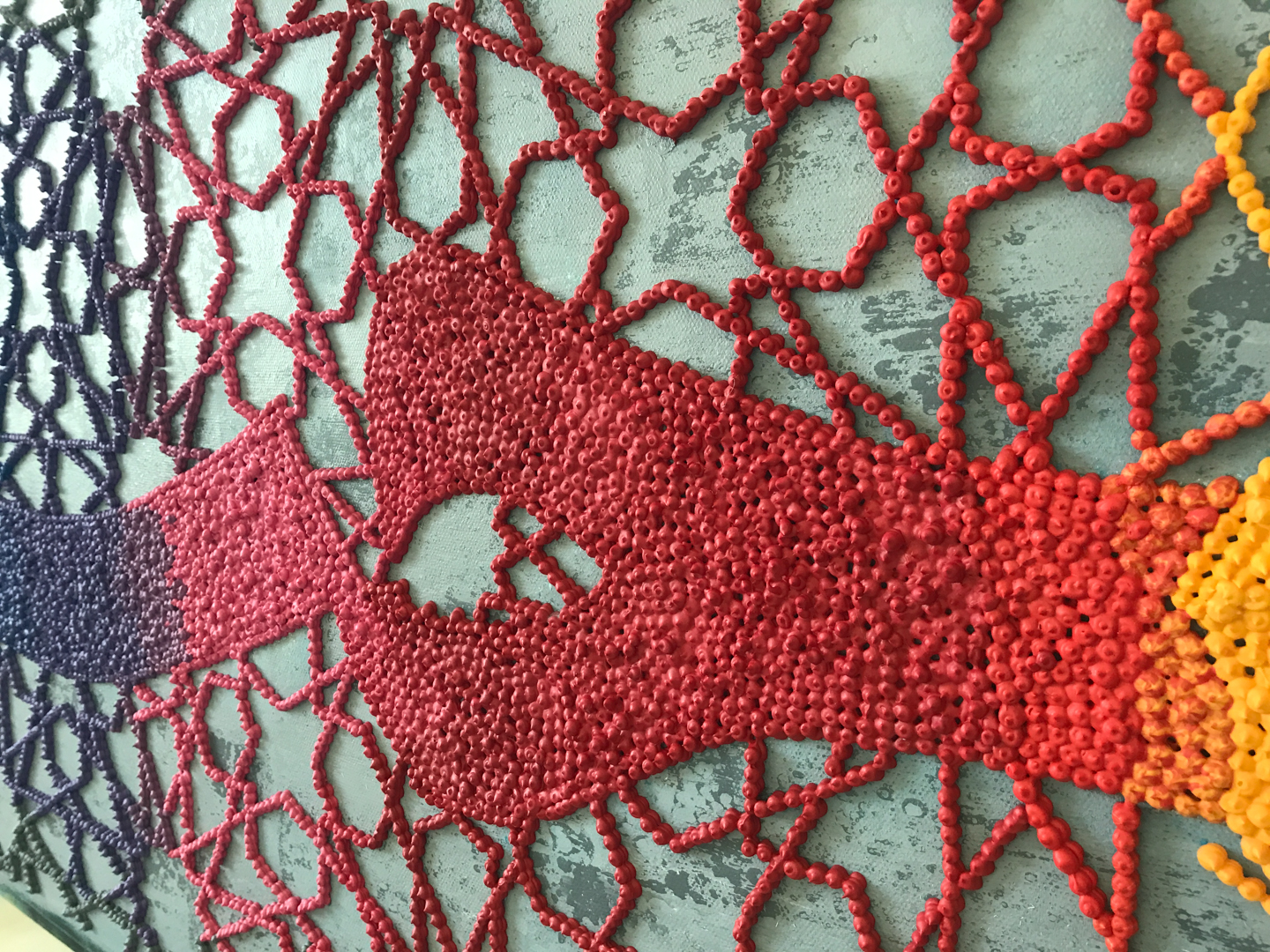Meticulously built up with acrylic paint, her forms emerge from the surface like icing on a cake. Faridfar views her work as being quite rebellious among modern art produced in post-Islamic Iran. Although the Persian Empire had a rich figurative tradition, the Muslim conquest of Persia in the 7th century imposed strict rules forbidding the depiction of God, the Prophet Muhammad, and animate beings such as humans and animals to prevent them from becoming objects of idolatry. This resulted in a massive artistic renewal directed towards geometric abstraction. As a result, Faridfar’s crowd of impasto is a subtle nod to standing up against the constraints of conservatism in society.