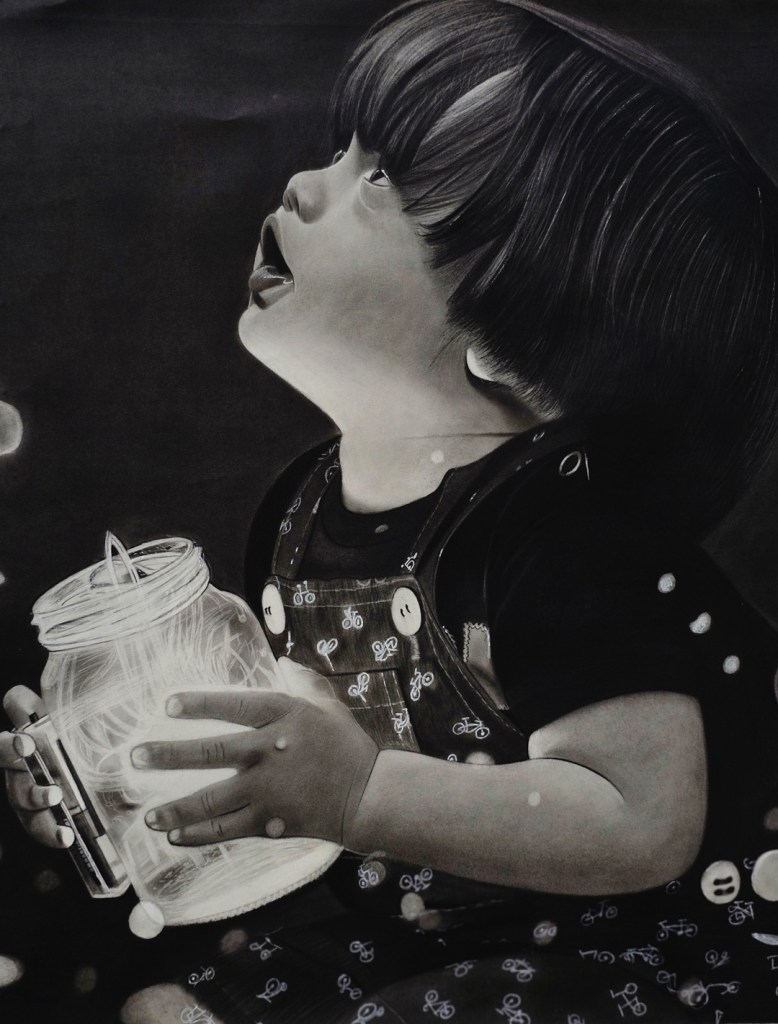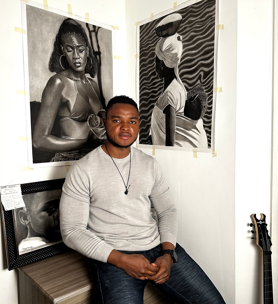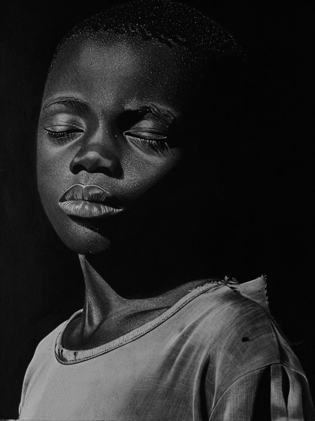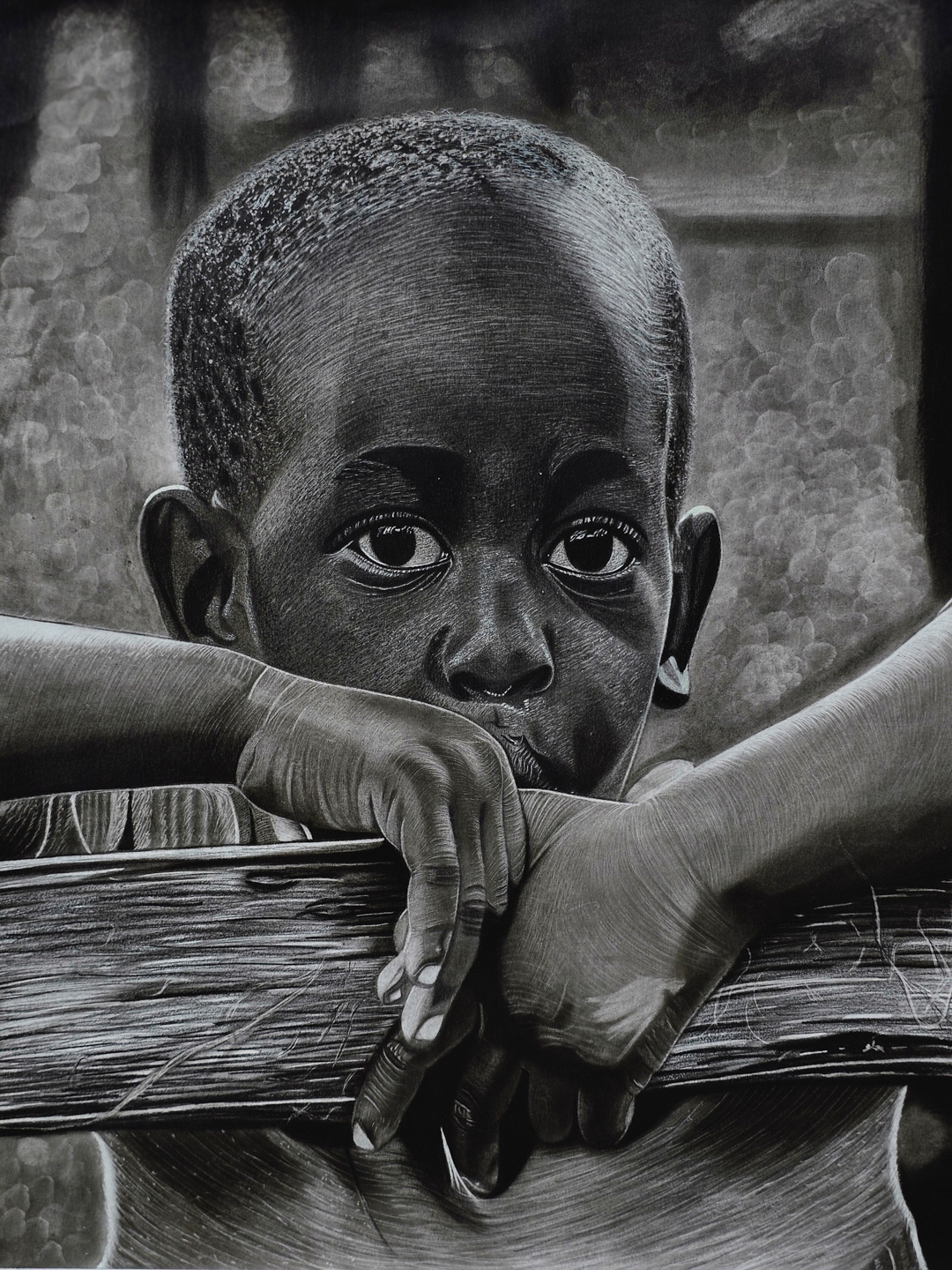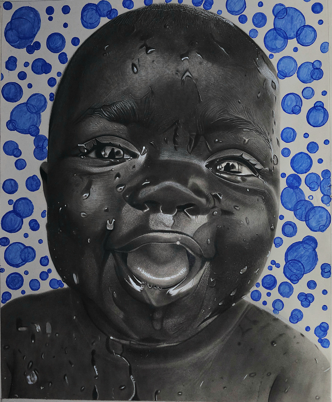 Meanwhile, the Smile series (2021 – ongoing) is a vibrant celebration of womanhood centring on the beauty of the sitter’s joyful expression. Smile III (2022) is an especially good example of the artist’s proficiency with charcoal and graphite, enabling him to render droplets of rain with effortless realism. Mother’s Love (2023) extends this tribute to the strength and sacrifice of mothers around the world.