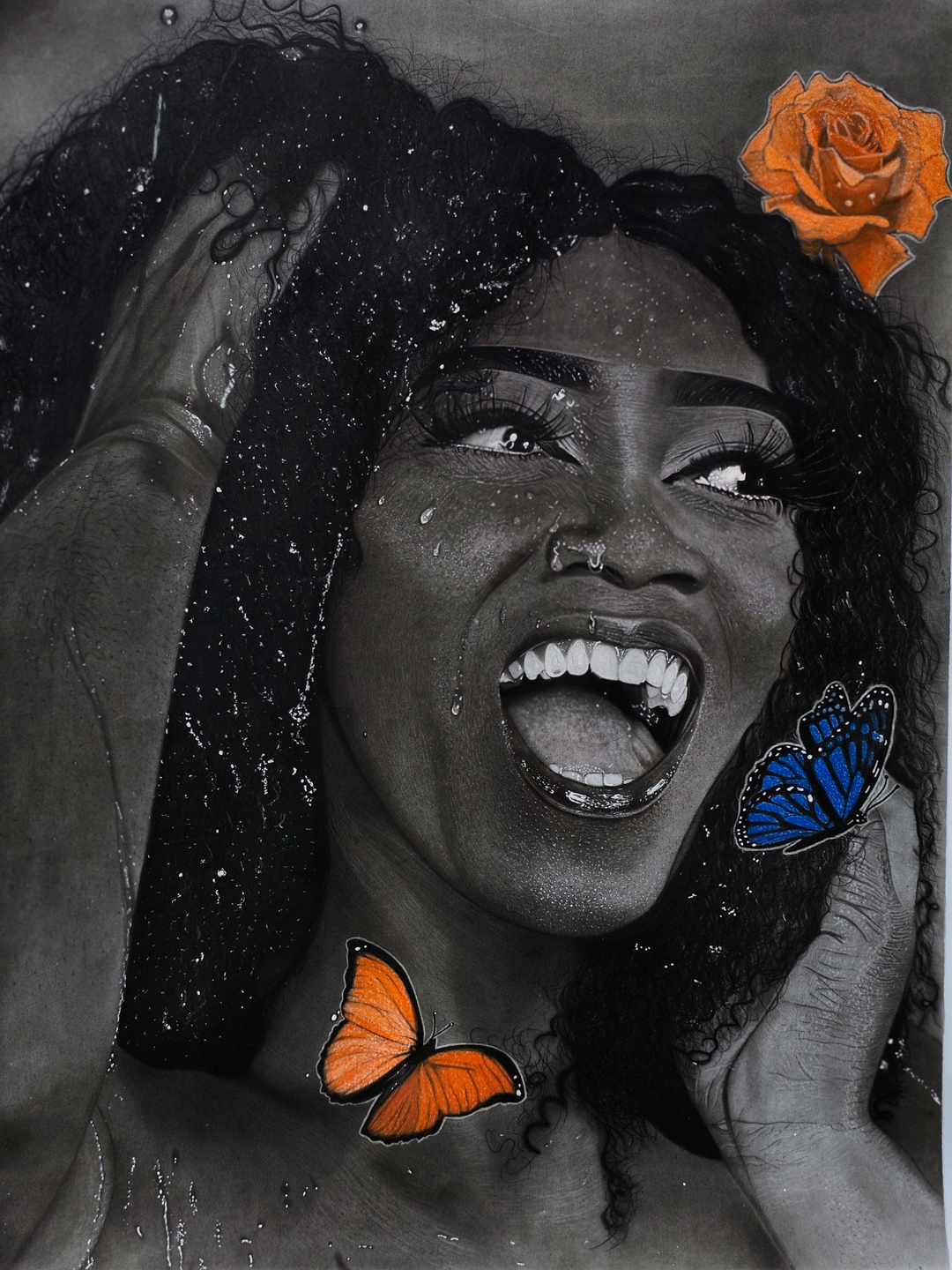 While the monochrome aesthetic is EmmieJazzy’s bread and butter, he has begun to incorporate colourful elements using mixed media, such as acrylic paint. In Smile IV (2023), flowers and butterflies serve as a symbolic reflections of the sitter’s emotions and life journey, channelling themes of freedom, growth, and metamorphosis.