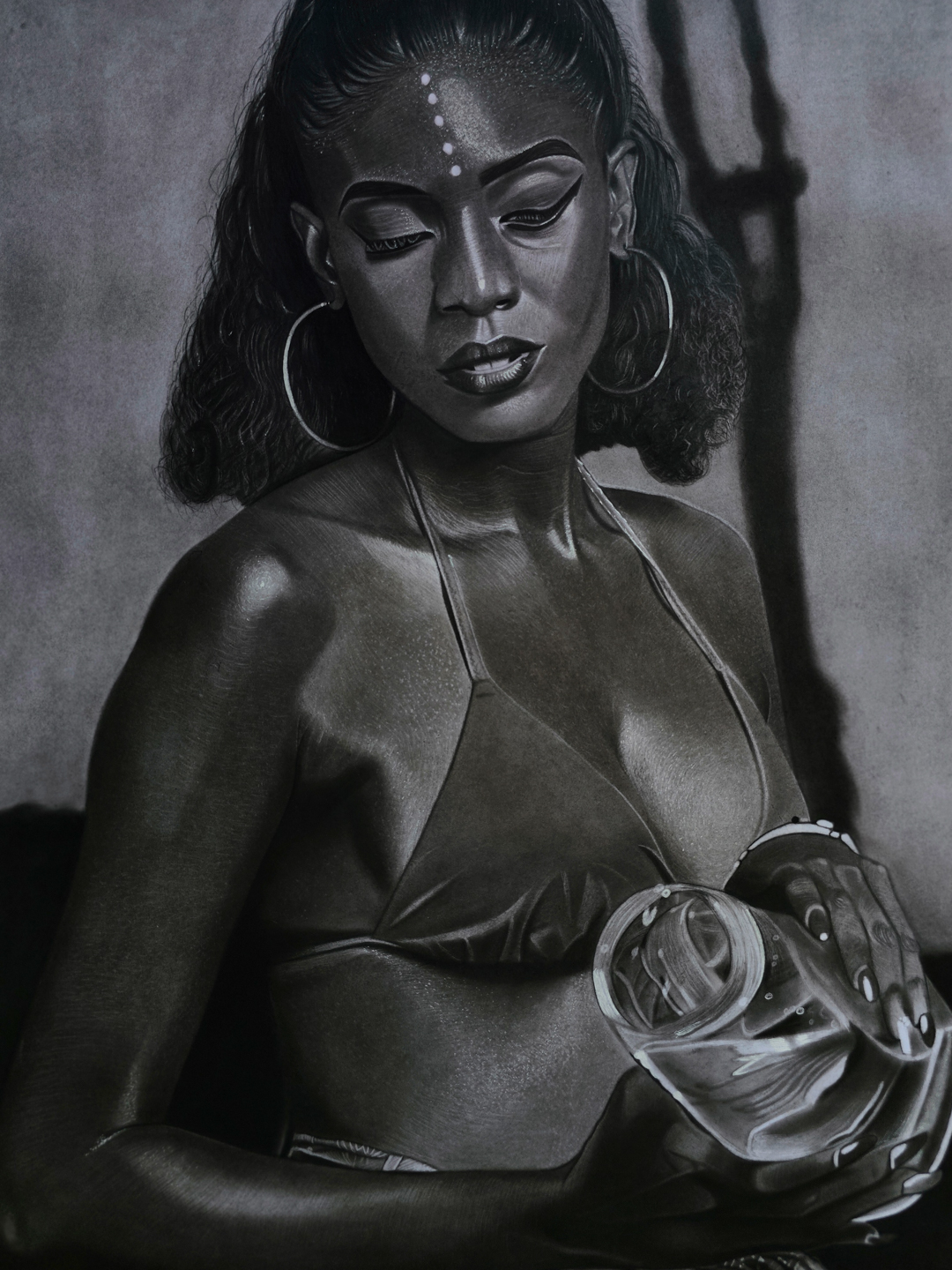 A member of the artist-led, non-profit arts organisation ArtCan, EmmieJazzy’s practice encompasses several distinct strands, each touching on a core aspect of human experience. Stillness appears to be a unifying theme across many of his drawings – often quite large in scale – as can be seen in Reflection II (2022) from his Identity series (2022 – ongoing). Born in Nigeria, ideas surrounding cultural heritage and identity permeate his output, such as Cultural Elegance (2023) which depicts an attractive sitter adorned with tribal-inspired facial markings and hoop earrings, inviting the audience to reflect on African femininity.