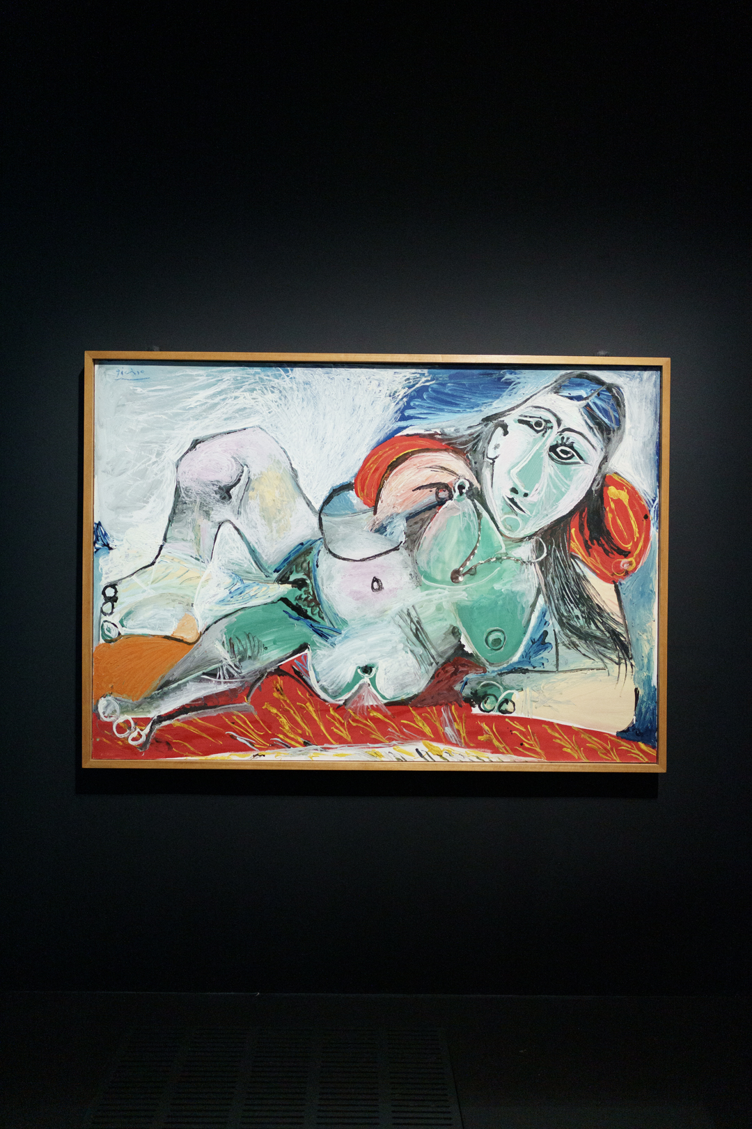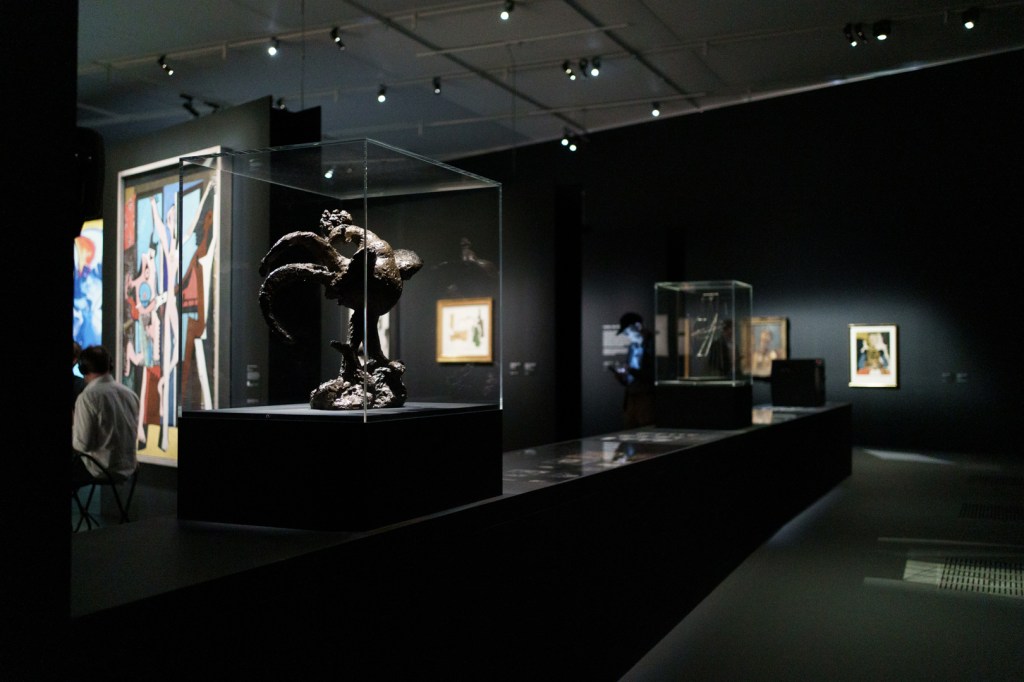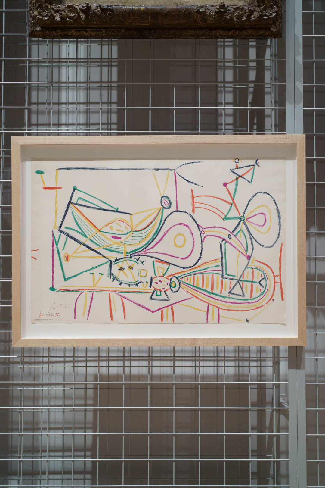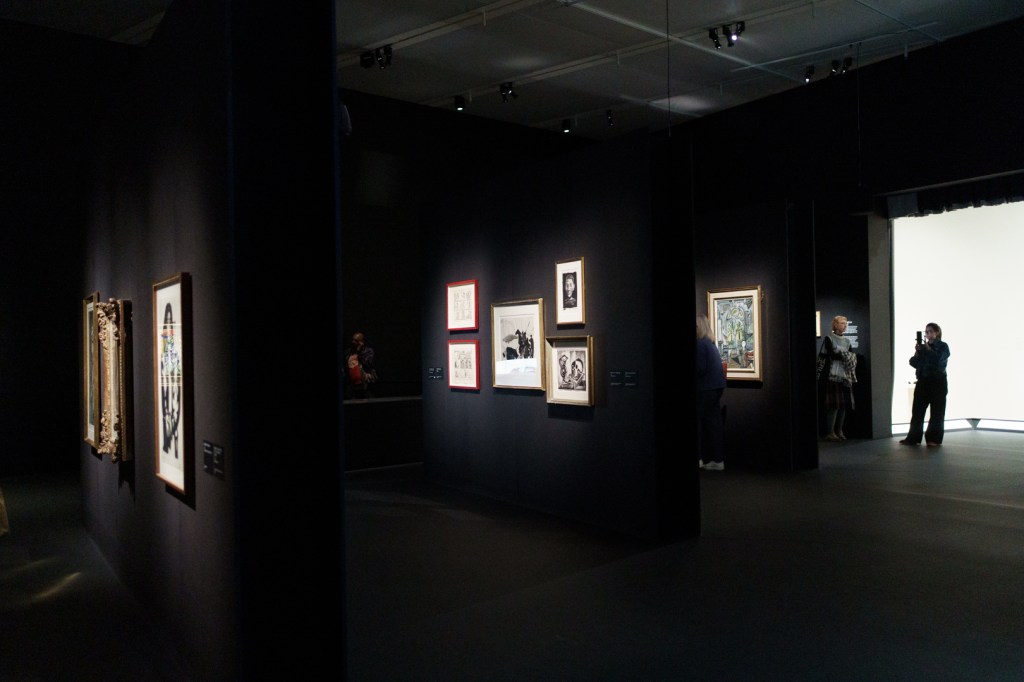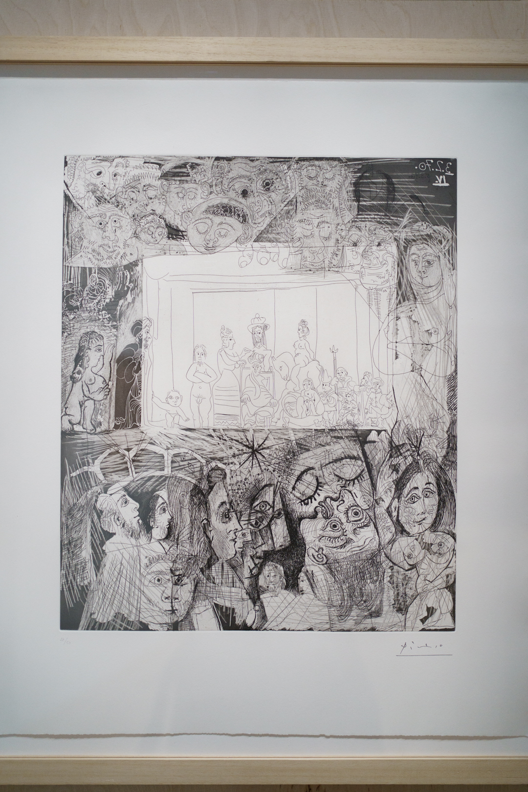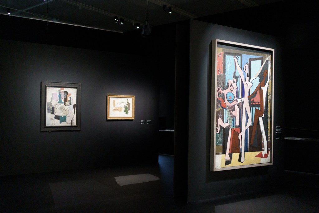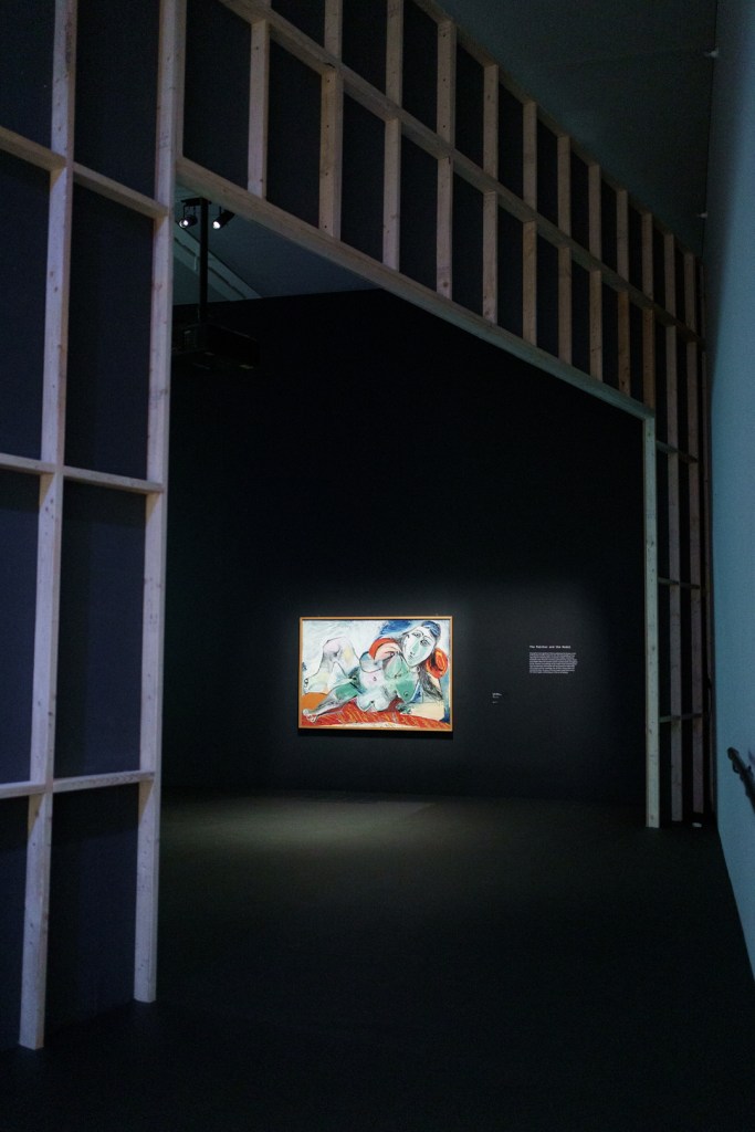 While the exhibition celebrates the people and playful characters in Picasso’s art, it also highlights the performativity of museums, their collections, and exhibition design. In fact, even the lighting changes like spotlights in a theatre, while the soundtrack accompanying the 1956 documentary Le mystère Picasso permeates the room.