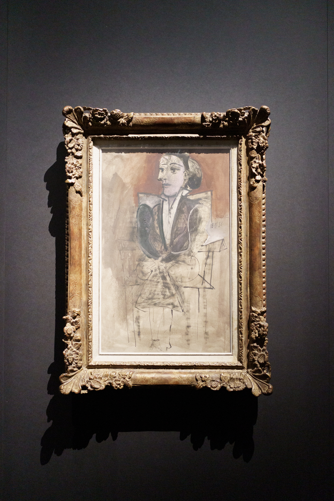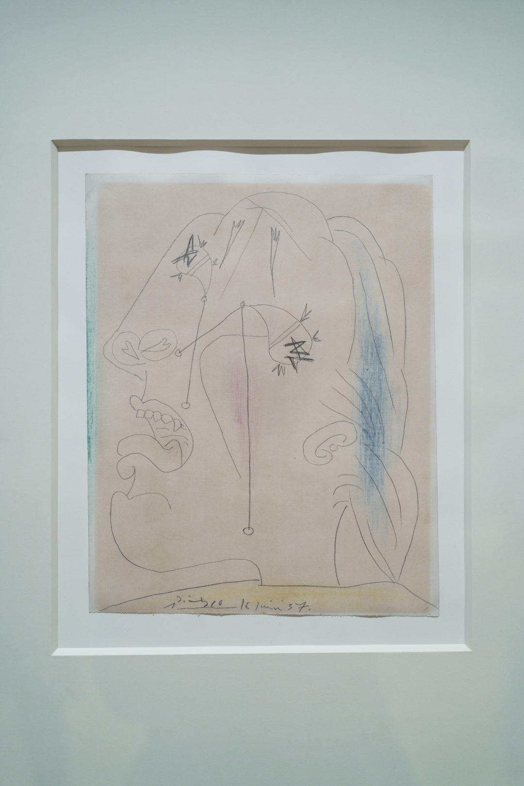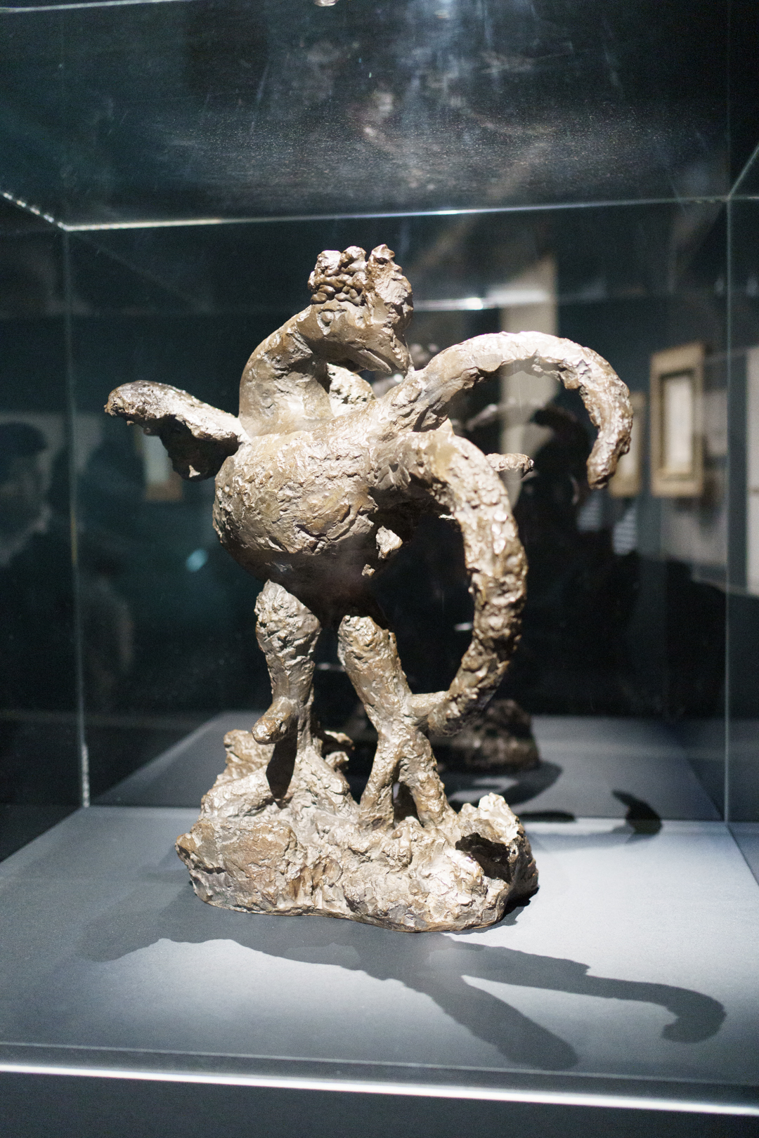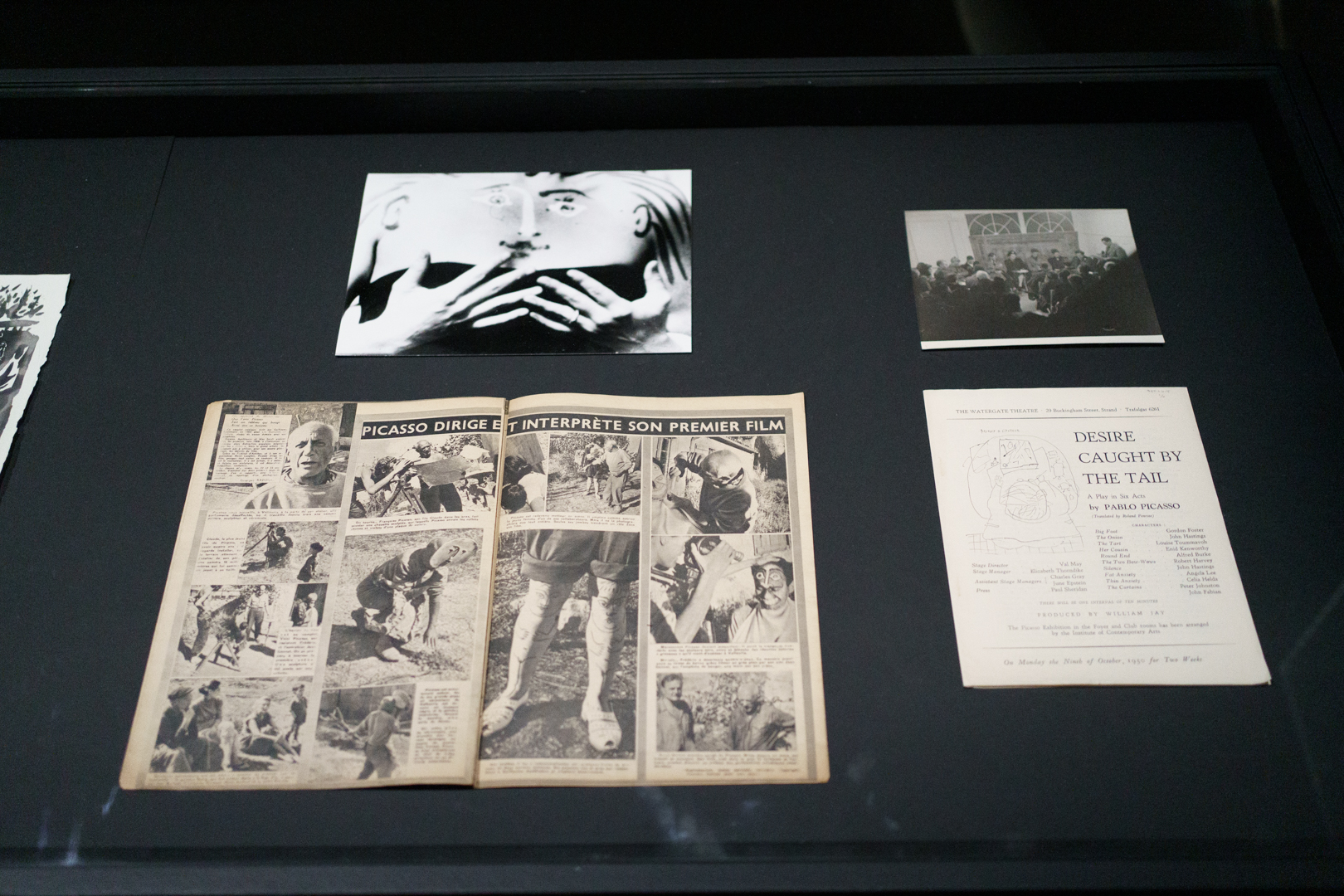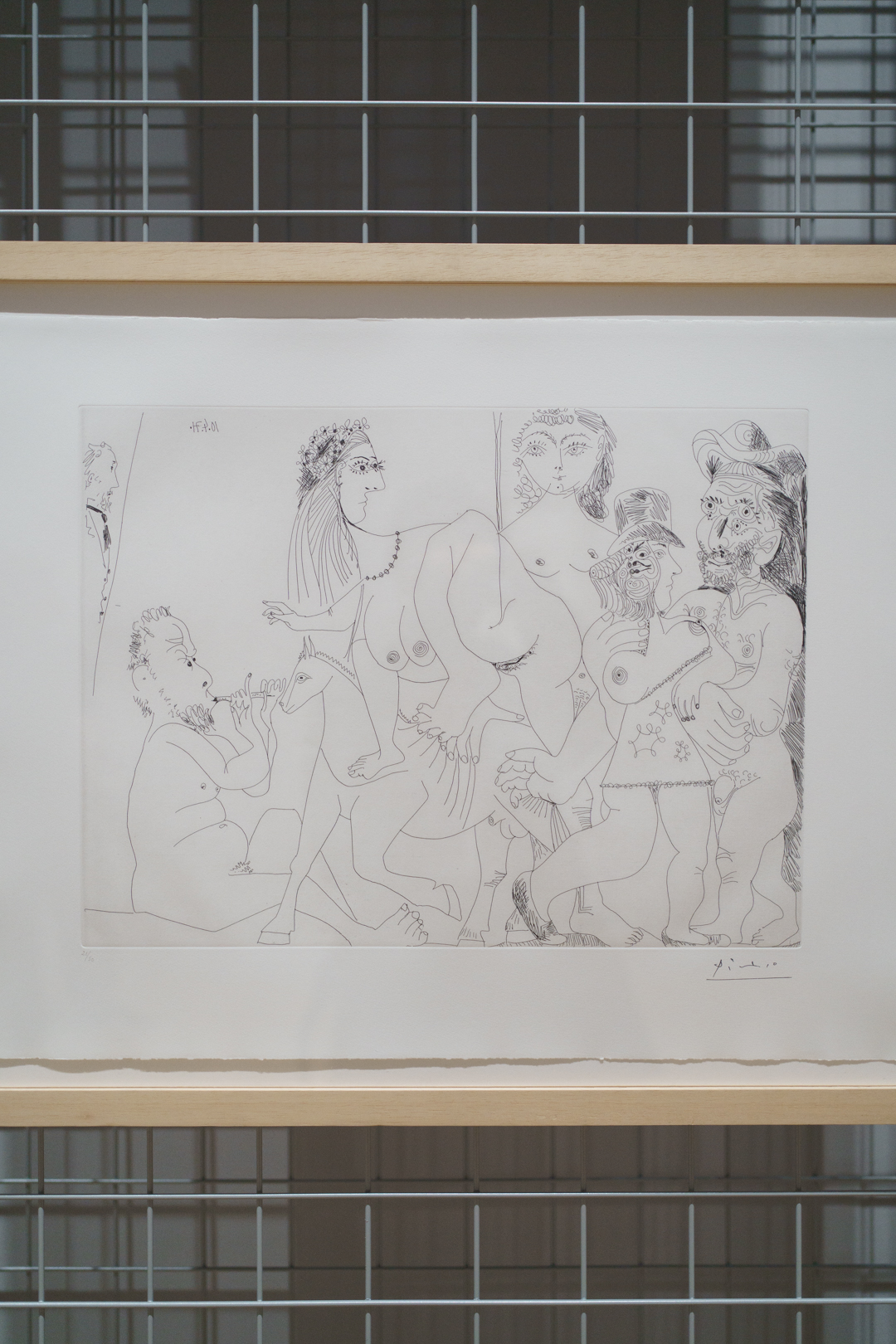 While the exhibition celebrates the people and playful characters in Picasso’s art, it also highlights the performativity of museums, their collections, and exhibition design. In fact, even the lighting changes like spotlights in a theatre, while the soundtrack accompanying the 1956 documentary Le mystère Picasso permeates the room.