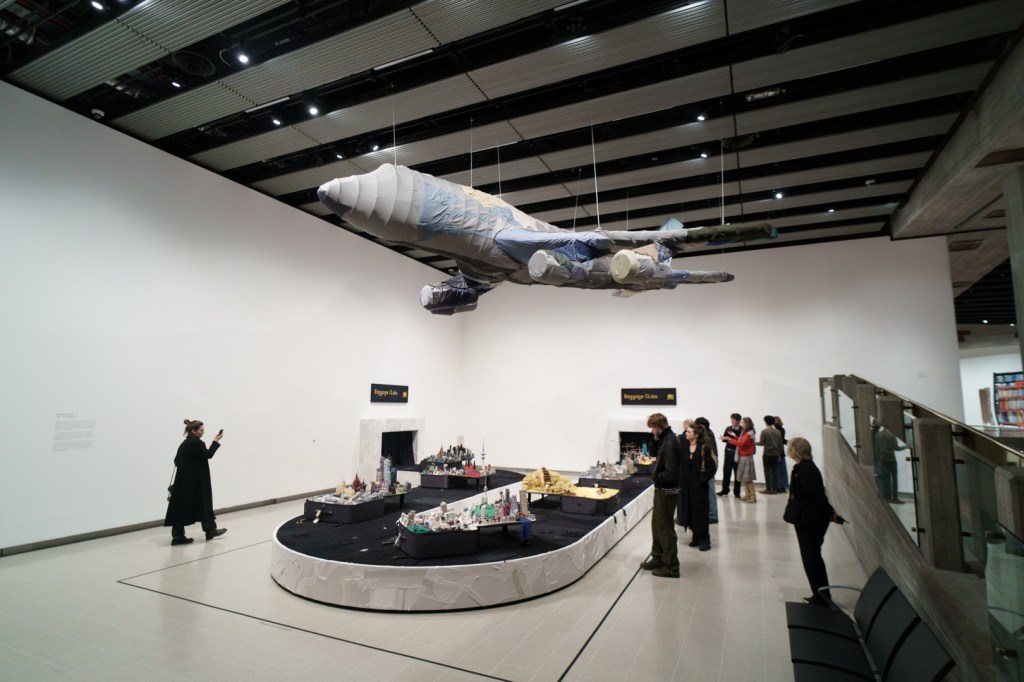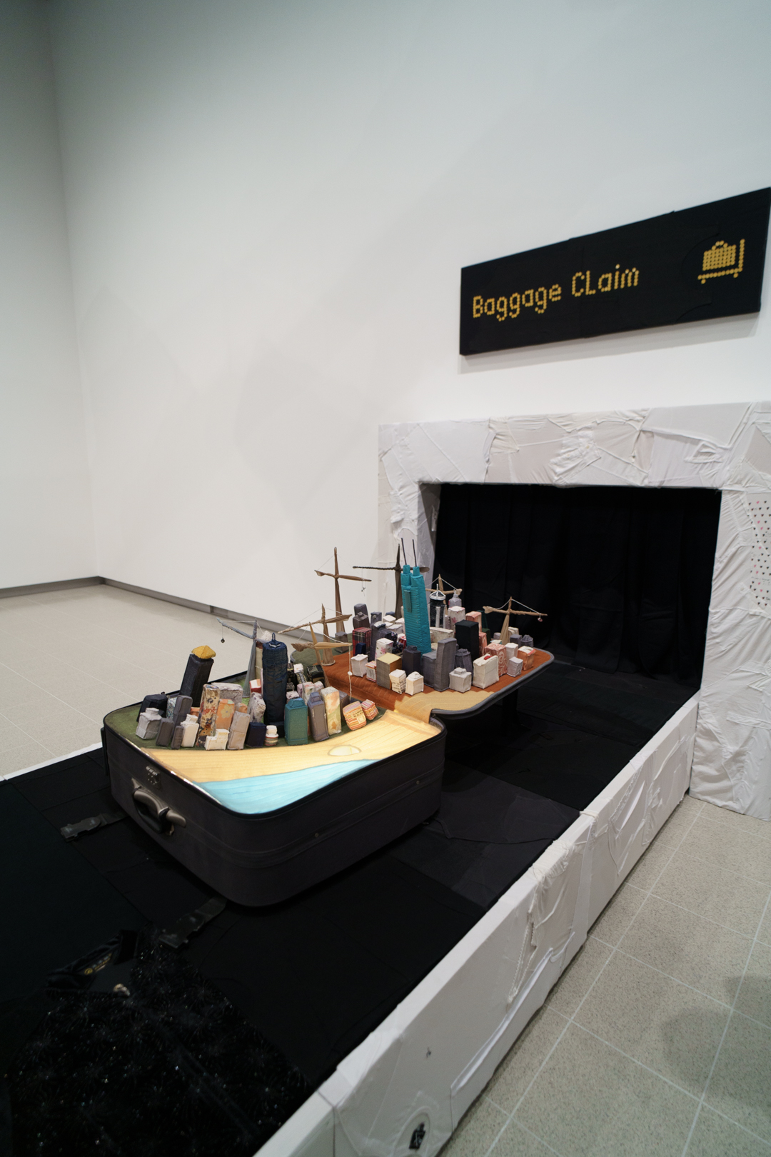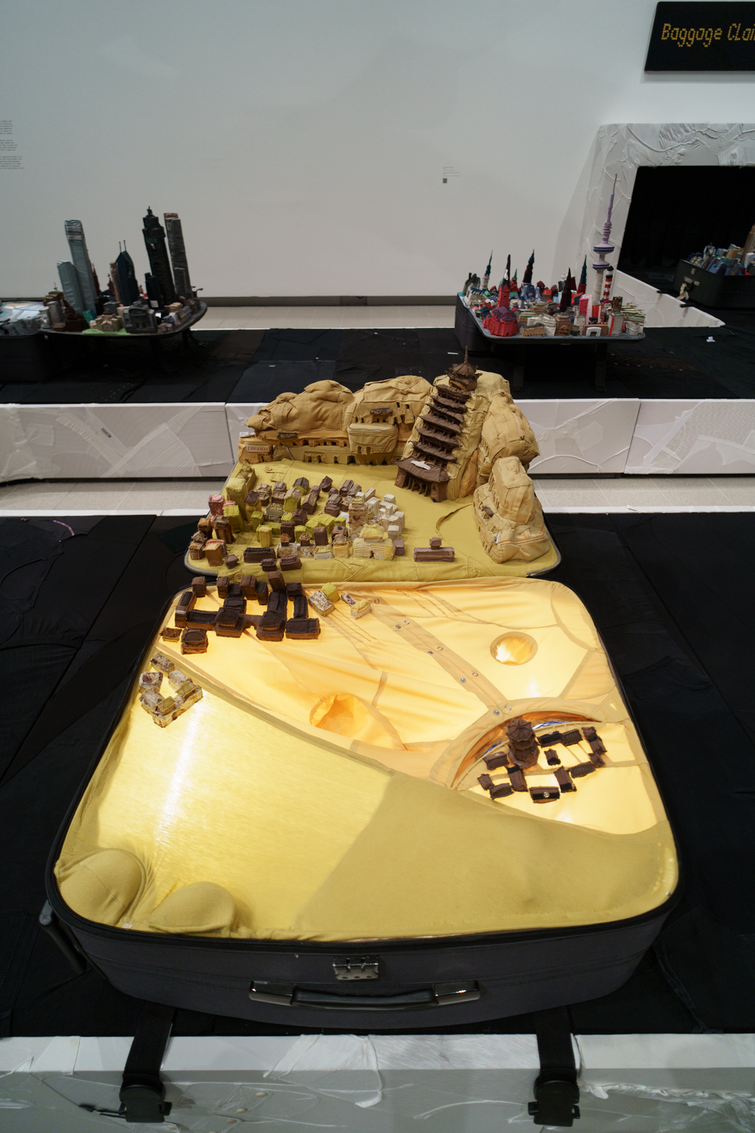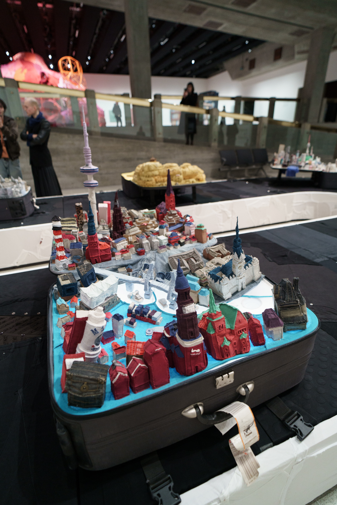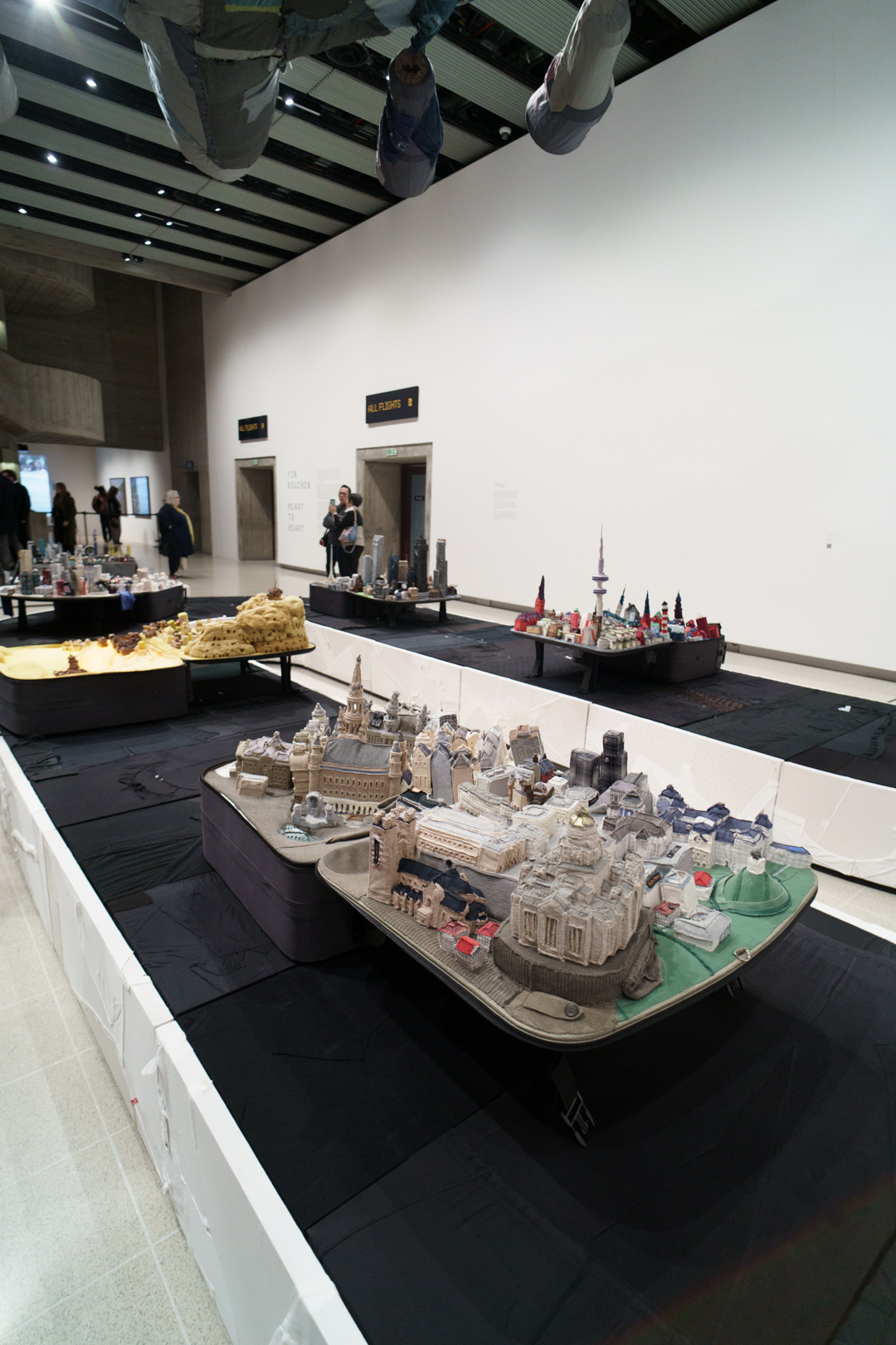 Downstairs, Yin’s portable cities greet us at the door, where little models of cities like London, Seoul, and Dunhuang emerge from suitcases on a baggage reclaim while a giant aircraft flies over the visitor. Off to the side, there are even luggage trolleys. Each city is woven from the clothes of its inhabitants, emphasising the migratory sense of home of our changing lives.