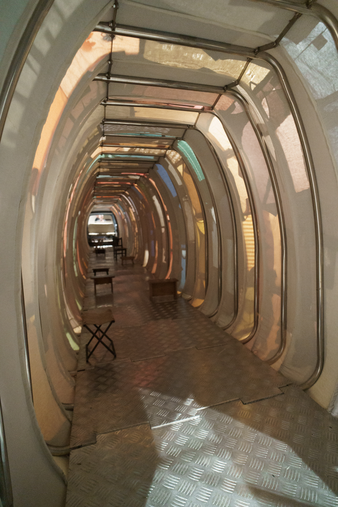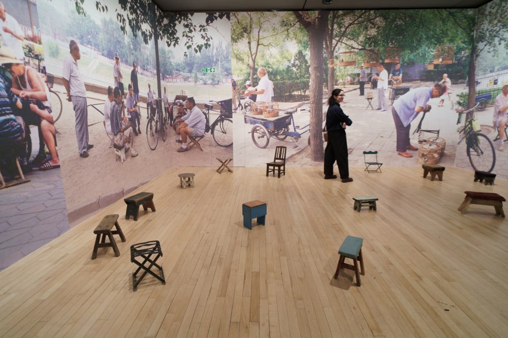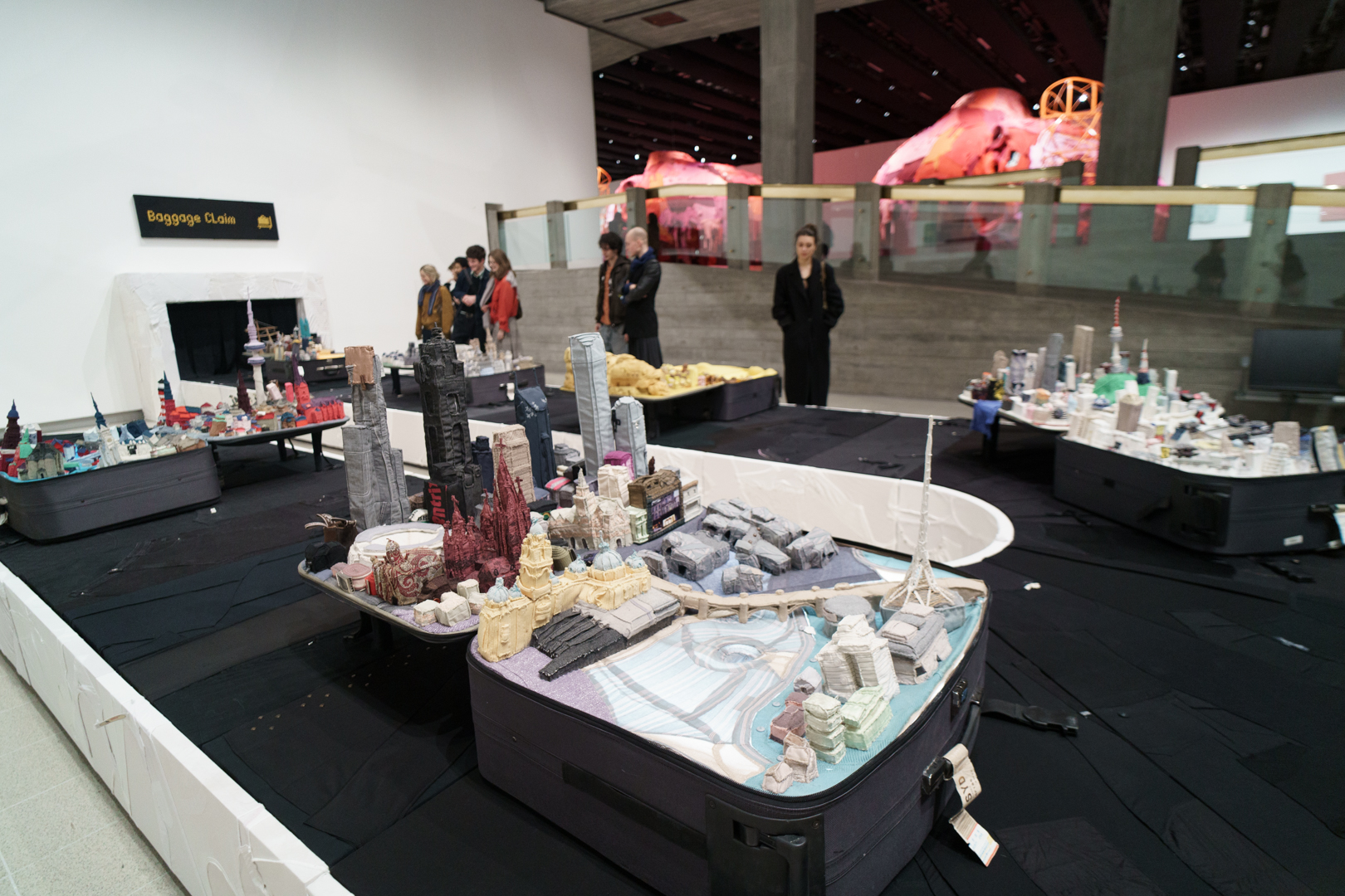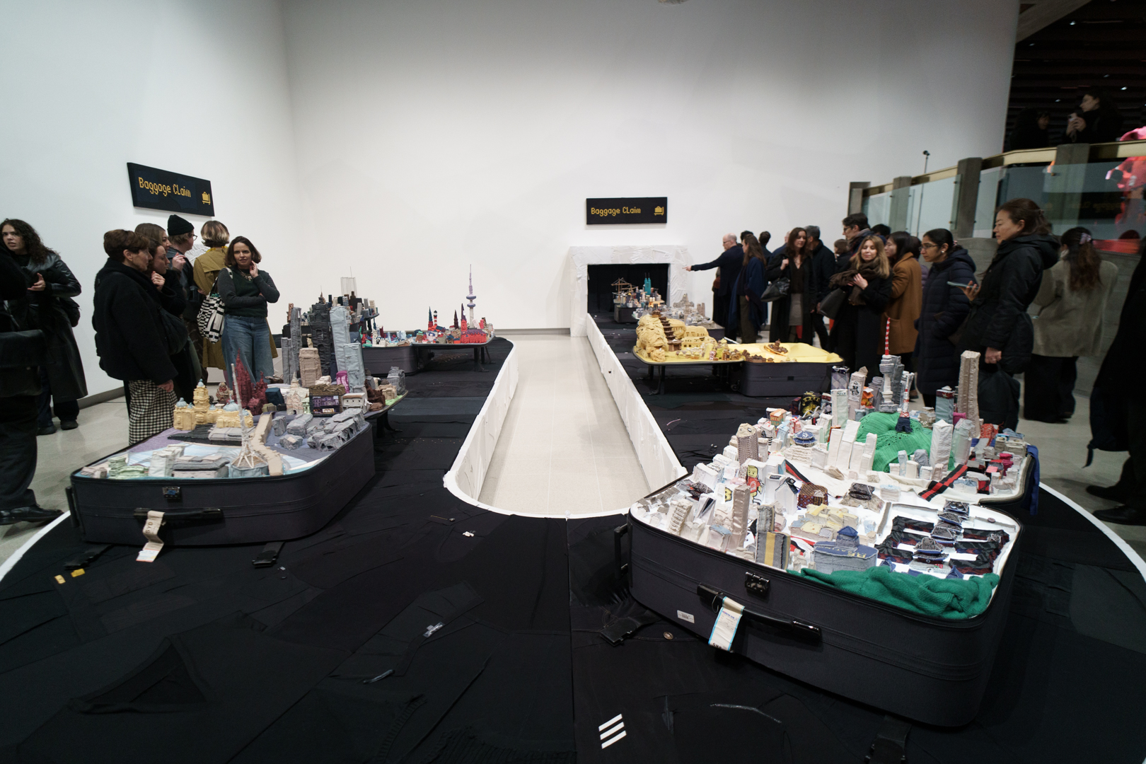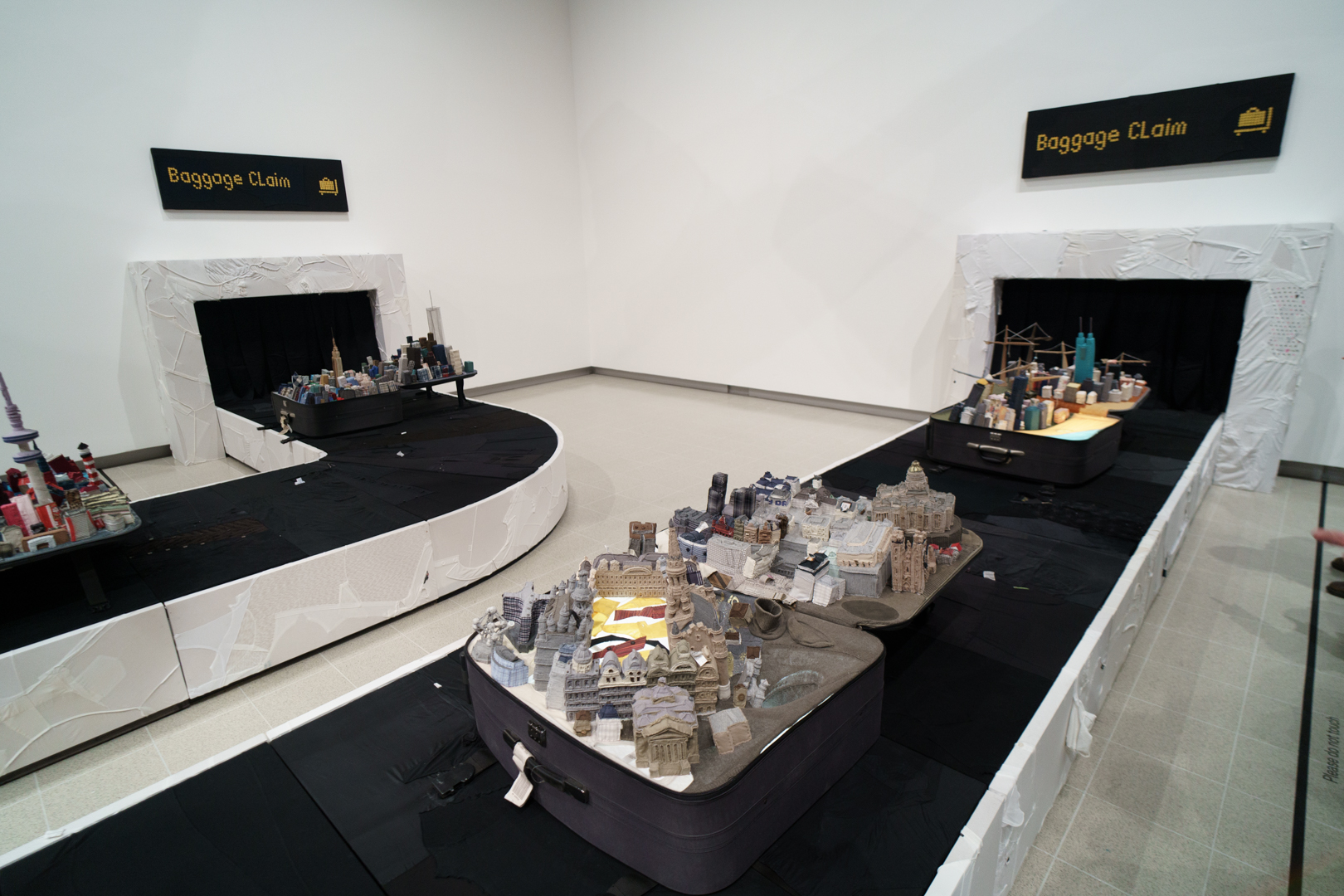Downstairs, Yin’s portable cities greet us at the door, where little models of cities like London, Seoul, and Dunhuang emerge from suitcases on a baggage reclaim while a giant aircraft flies over the visitor. Off to the side, there are even luggage trolleys. Each city is woven from the clothes of its inhabitants, emphasising the migratory sense of home of our changing lives.