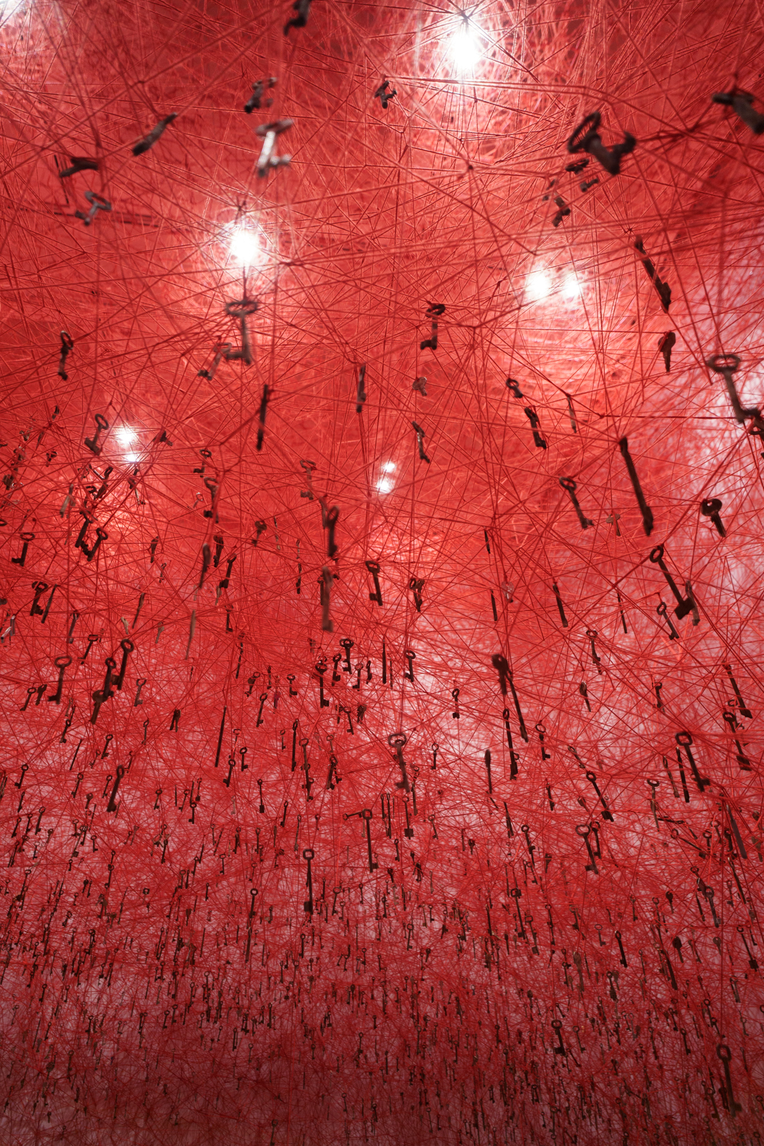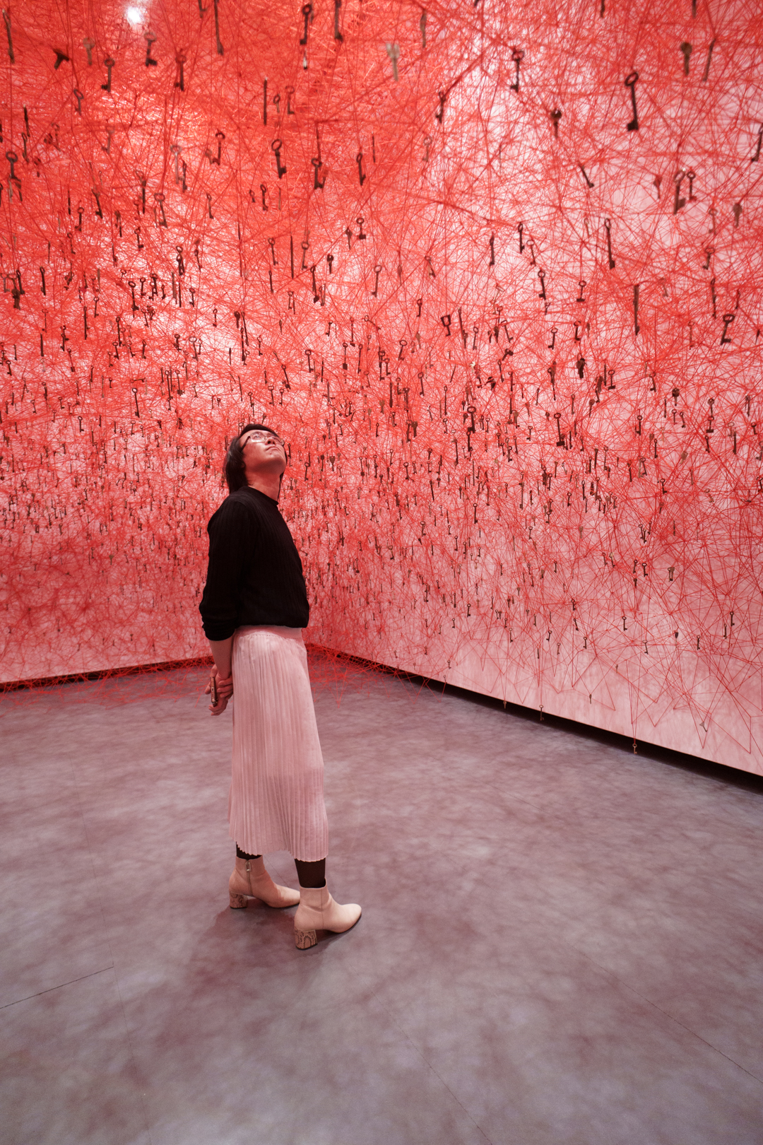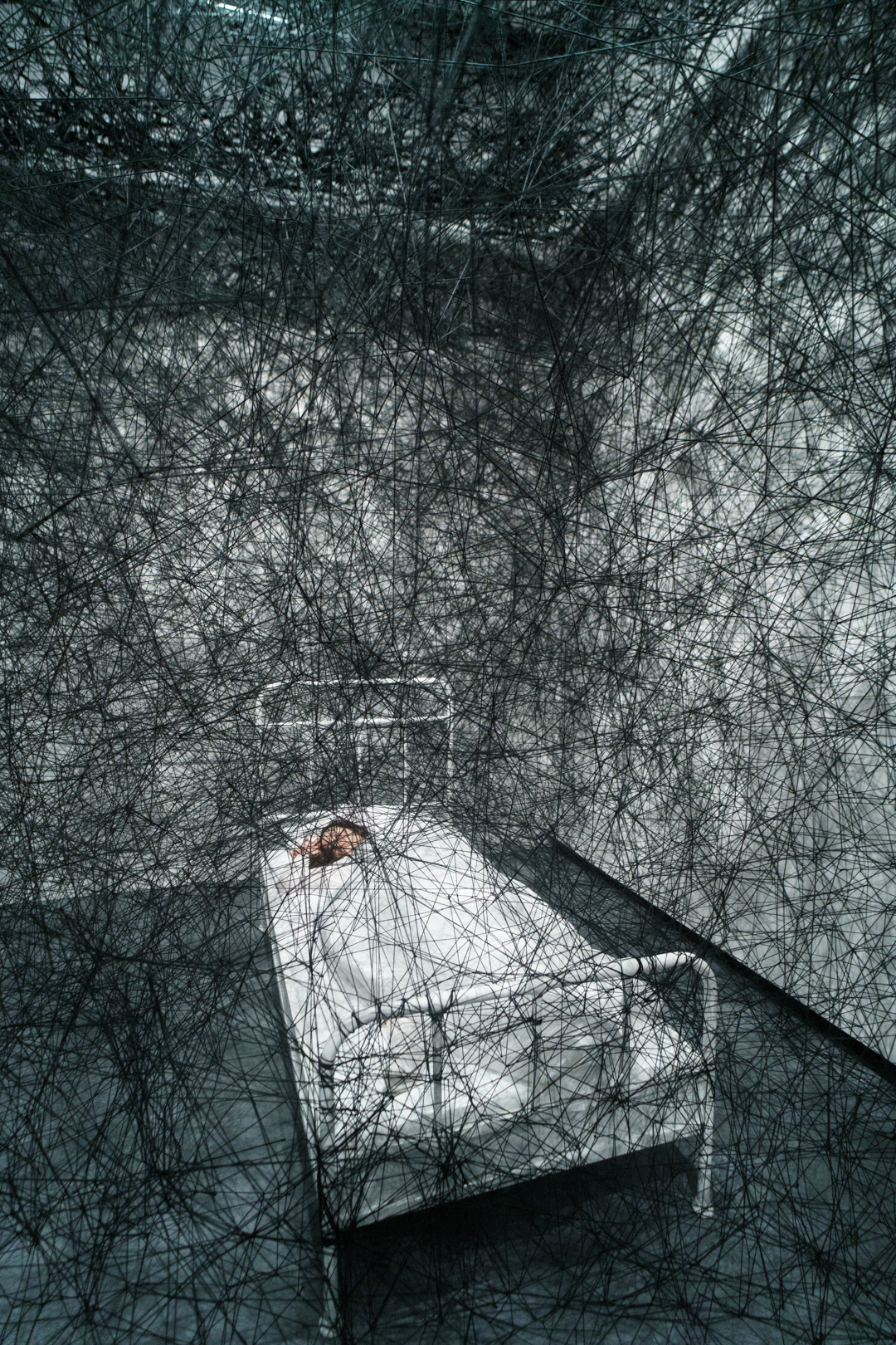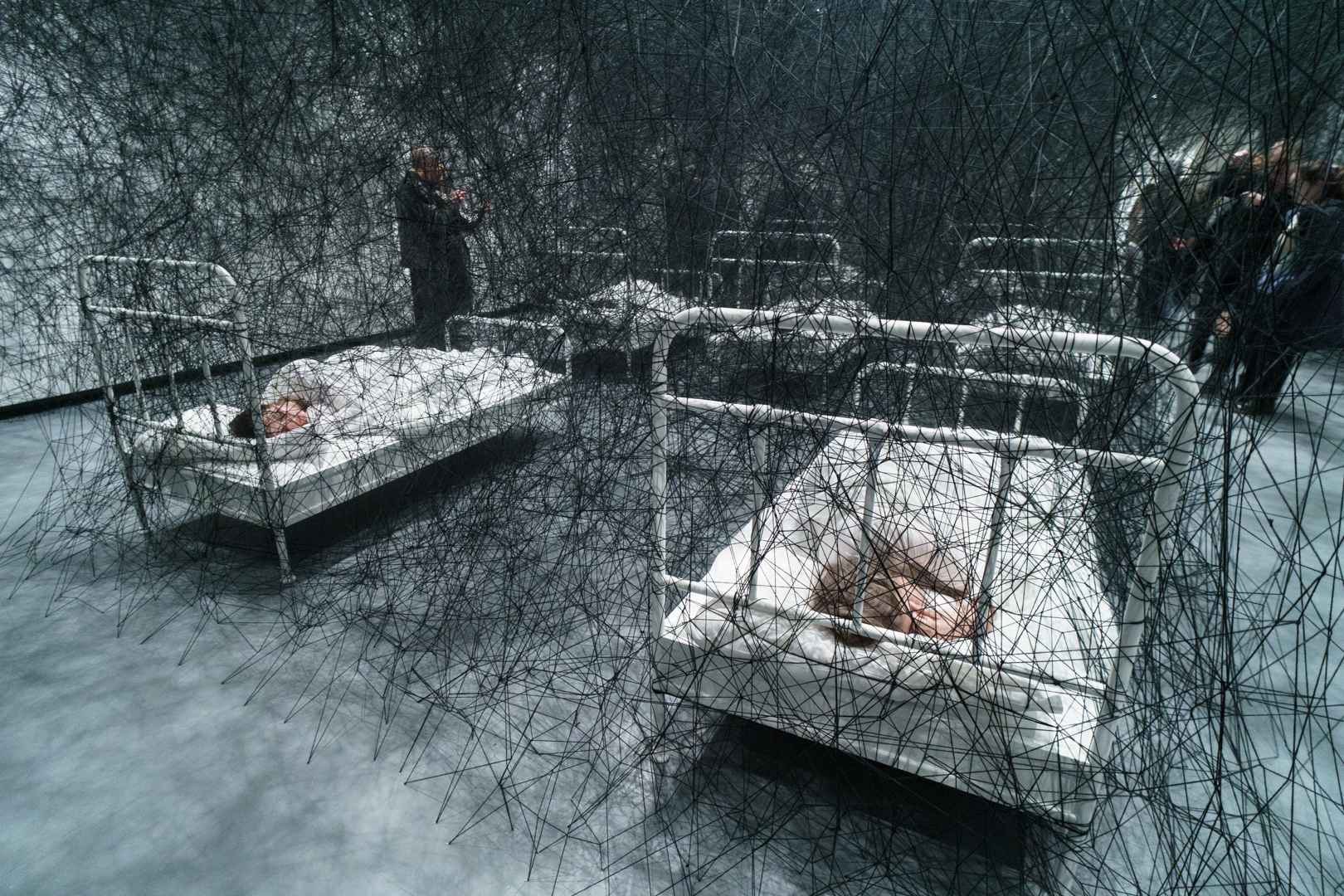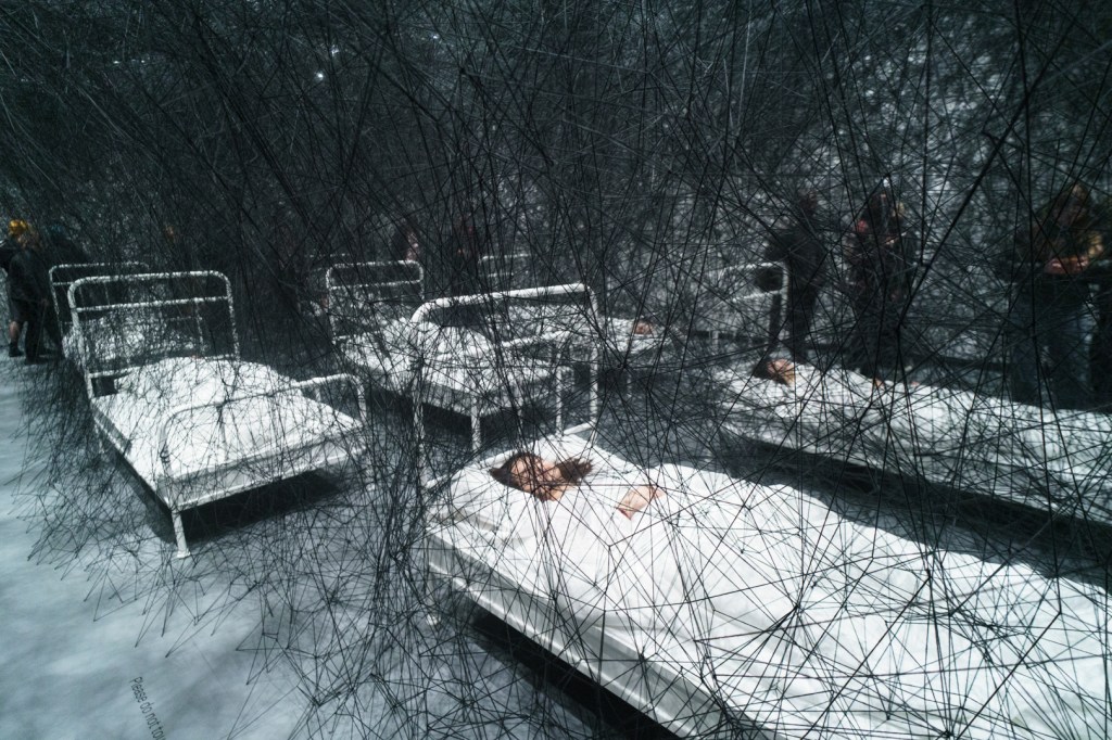 Upstairs, Shiota’s Threads of Life (2026) engulfs the visitor in a delicate web of red. Keys dangle at every turn and the space becomes a cage built from interconnected experiences. Similarly, During Sleep (2026) is a performance piece where performers lie in beds entrapped in black thread; it’s deeply unsettling and frankly quite creepy to walk through, as if having entered a spider’s web.
