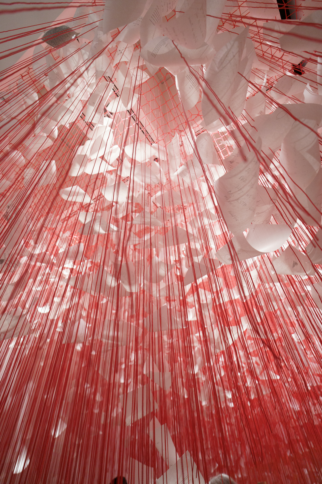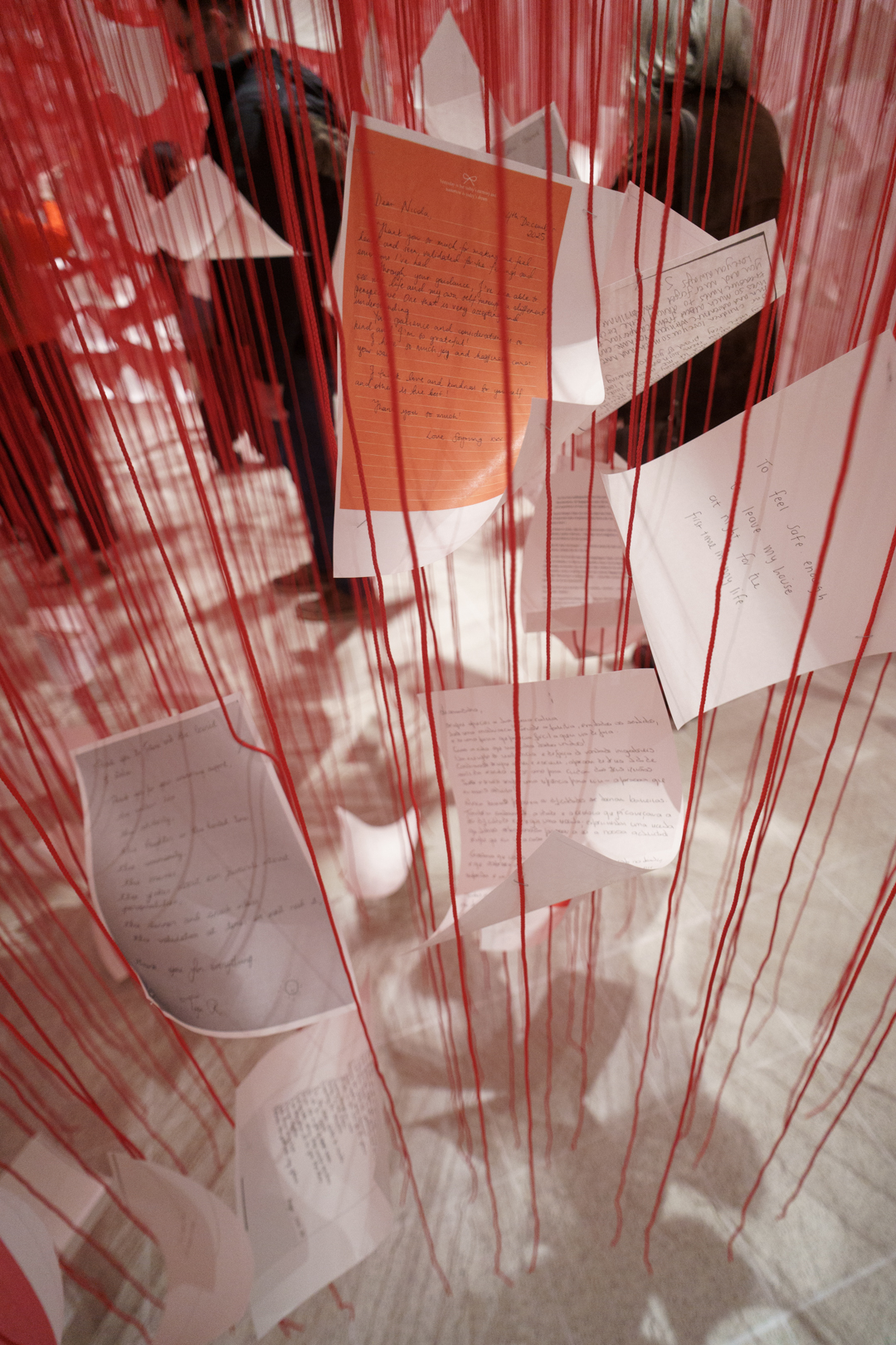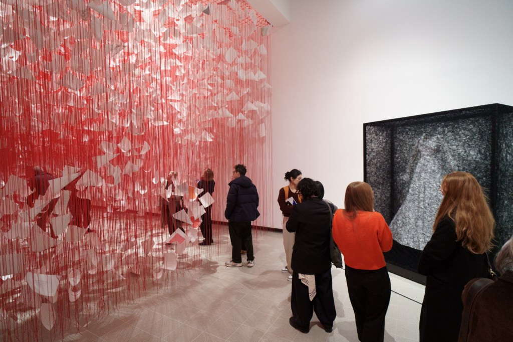Letters of Thanks (2026) is more hopeful, featuring uplifting letters of gratitude crowd-sourced from the general public attached to red thread dangling from the ceiling. It feels like walking through a bamboo forest filled with love.